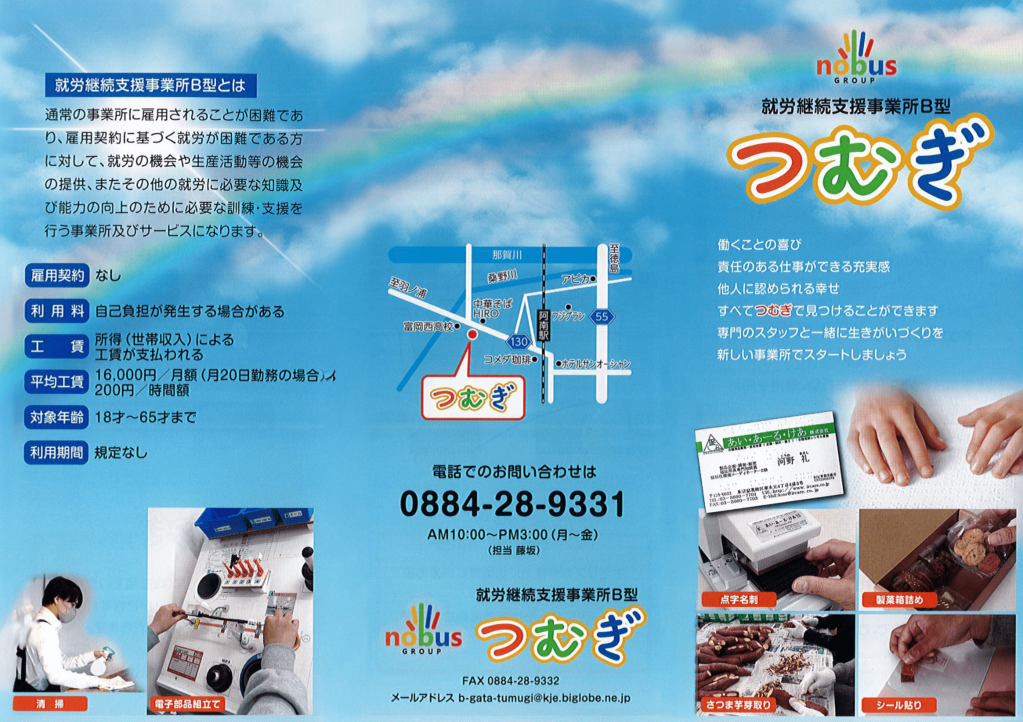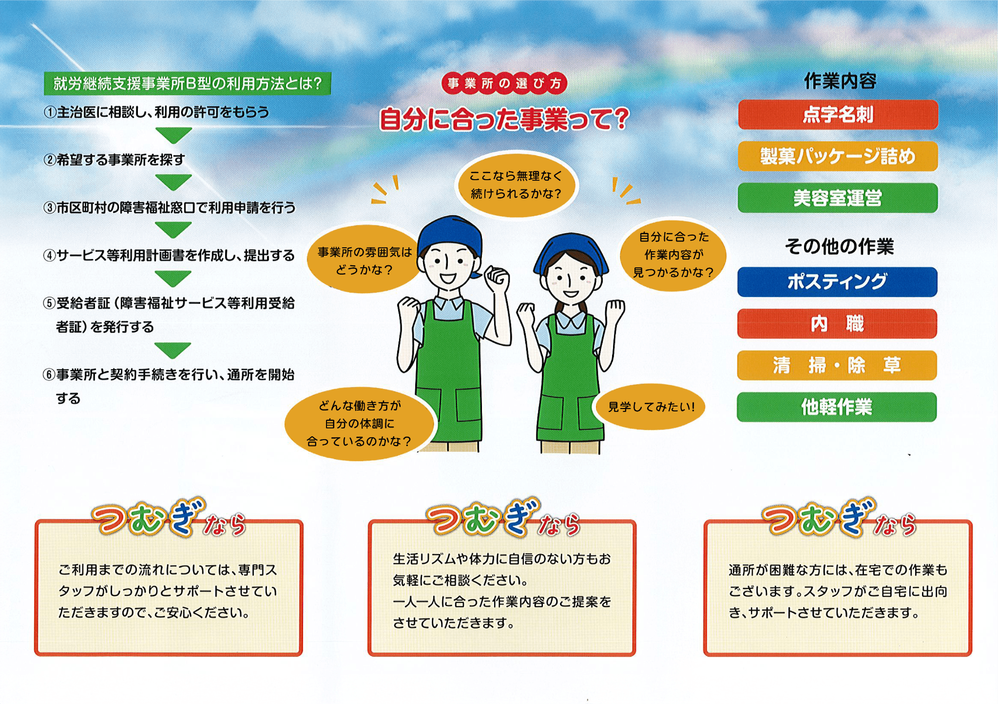 通常の事業所に雇用されることが困難であり、雇用契約に基づく就労が困難な方に対して、就労の機会や生産活動などの機会を提供。